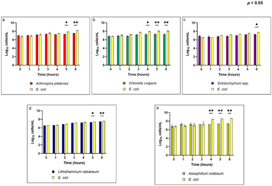 Evaluation of growth inhibition of Arthrospira platensis, Chlorella vulgaris, Schizochytrium spp., Lithothamnium calcareum and Ascophyllum nodosum extracts at a dilution of 1:4 against E. coli. (a) Growth inhibition of Arthrospira platensis. (b) Growth inhibition of Chlorella vulgaris. (c) Growth inhibition of Schizochytrium spp. (d) Growth inhibition of Lithothamnium calcareum. (e) Growth inhibition of Ascophyllum nodosum. Data are shown as means and standard deviations. Asterisk means (n = 3) with different superscripts are significantly different, * p < 0.0001, ** p < 0.05.