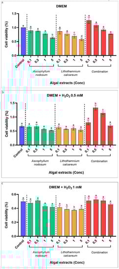 Cells were treated with different concentrations of Ascophyllum nodosum and Lithotamnium calcareum (0.1–5 vol%). In a second set of experiments, cells were pre-treated for 3 h with or without Ascophyllum nodosum and Lithotamnium calcareum (0.1–5 vol%) in a DMEM medium. Subsequently, the cells were challenged with H2O2 (0.5 and 1 mM) for 1 h individually to induce oxidative damage.