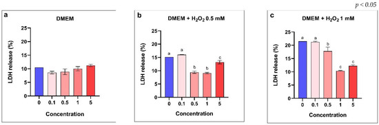 Membrane integrity of intestinal IPEC-J2 cells. (a) Dose−response curves with different concentrations of the combination of Ascophyllum nodosum and Lithotamnium calcareum; (b) Membrane integrity of IPEC-J2 cells challenged with H2O2 0.5 mM and pre-treated with the combination of Ascophyllum nodosum and Lithotamnium calcareum; (c) Membrane integrity of IPEC-J2 cells challenged with H2O2 1 mM and pre-treated with the combination of Ascophyllum nodosum and Lithotamnium calcareum. Data are shown as means and standard deviations. a–c Means (n = 3) with different superscripts are significantly different (Treatment p < 0.05).