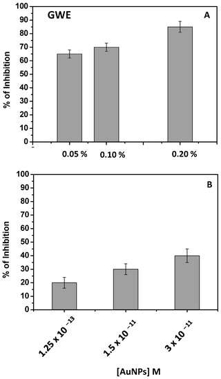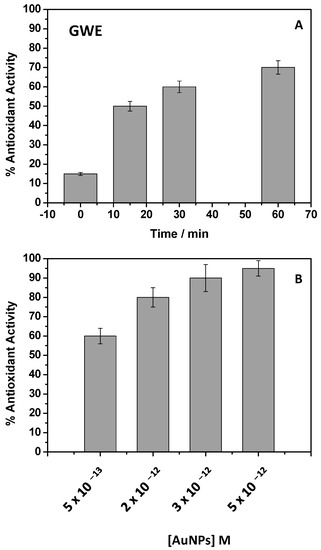 - Ismail, E.H.; Khalil, M.M.H.; Al Seif, F.A.; El-Magdoub, F. Biosynthesis of Gold Nanoparticles Using Extract of Grape (Vitis Vinifera) Leaves and Seeds. Prog. Nanotechnol. Nanomater. 2014, 3, 1–12. [Google Scholar]