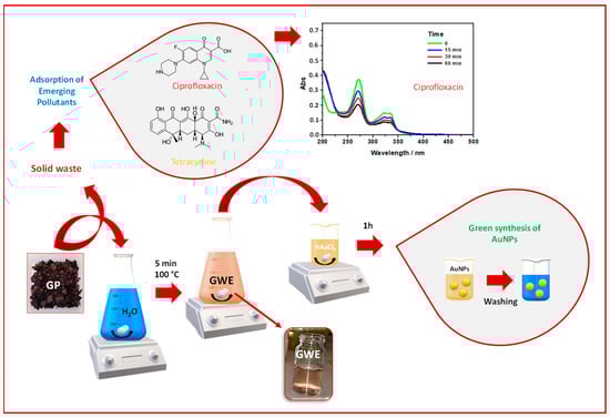 The “End Life” of the Grape Pomace Waste Become the New Beginning: The Development of a Virtuous Cycle for the Green Synthesis of Gold Nanoparticles and Removal of Emerging Contaminants from Water