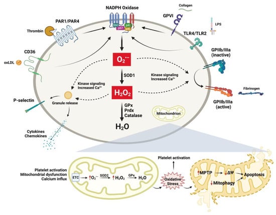 Type 2 diabetes mellitus (T2DM) is a well-established cardiovascular risk factor and is significantly more prevalent in the elderly population []. Patients with T2DM exhibit platelet hyperreactivity, and several groups have provided evidence that hyperglycemia induces alterations in oxidative pathways in platelets. For instance, the expression of the P2Y12 receptor has been shown to be significantly increased in platelets from T2DM patients and is constitutively activated []. Stimulation of the P2Y12 receptor under high glucose conditions in animal models has been shown to induce pathways that increase platelet intracellular ROS, contributing to platelet hyperactivity and limiting certain antiplatelet therapies []. There is evidence that platelets from patients with T2DM with poor glycemic control express higher levels of Nox1 []. Hyperglycemia also can induce mitochondrial superoxide generation, potentiating collagen-induced platelet activation []. Urinary levels of platelet thromboxane (TX) metabolites are elevated in patients with T2DM [], and it was demonstrated that aldose reductase is an important enzyme that mediates hyperglycemia and collagen-induced platelet activation and TX release through a pathway involving ROS generation []. Moreover, aldose reductase also contributes to mitochondrial dysfunction/damage and platelet apoptosis in the setting of hyperglycemia []. Other pathways of mitochondrial-ROS-driven platelet activation in diabetes have been discussed in the section on platelet mitochondria in aging (see above).