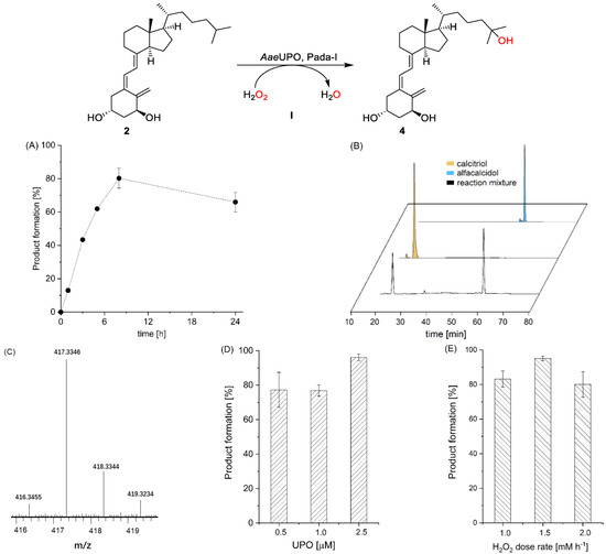 AaeUPO (Pada−I) catalyzed oxyfunctionalization of alfacalcidol to calcitriol (path I). Conditions: (A) [AaeUPO] = 0.5 μM, [substrate] = 2.5 mM, NaPi buffer (50 mM, pH 6), 40% (v/v) acetone, [H2O2] = 1.0 mM h−1, 24 h, 25 °C, 1 mL; (B) HPLC chromatograms of reaction solution and standard (small peaks in the standards indicate some impurities); (C) LC–MS chart of product calcitriol with mass spectrum displayed in [M + H]+; (D) conditions: [AaeUPO] = 0.5–2.5 μM, [substrate] = 2.5 mM, NaPi buffer (50 mM, pH 6), 40% (v/v) acetone, [H2O2] = 1.0 mM h−1, 8 h, 25 °C, 1 mL; (E) [AaeUPO] = 2.5 μM, [substrate] = 2.5 mM, NaPi buffer (50 mM, pH 6), 40% (v/v) acetone, [H2O2] = 1.0–2.0 mM h−1, 8 h, 25 °C, 1 mL. Error bars indicate the standard deviation of duplicate experiments (n = 2).