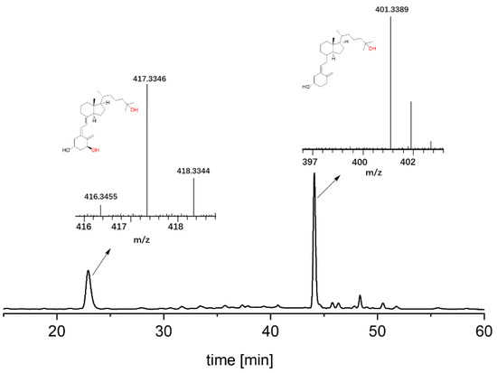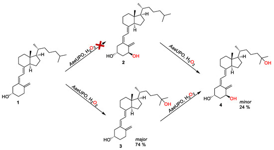 Next, we sought to determine whether it is possible to synthesize calcitriol directly from vitamin D3, which is a desirable strategy due to the commercial availability and low cost of vitamin D3, compared with alfacalcidol (Figure 3). In this way, calcitriol (4) synthesis can be obtained via the double hydroxylation at C-1 and C-25 of vitamin D3 (1), leading to alfacalcidol (2) and 25-hydroxyvitamin D3 (3), respectively. It was found that there was no formation of 2 from the oxidation of 1, as shown in Figure 3. Instead, 3 was obtained as the major product (74% product formation). The results agreed with the report by Gutiérrez et al. [30,31]. Interestingly, an amount of calcitriol (24% product formation) was also obtained, which was not observed in any early reports (Figure 3 and Figure 4). This indicates that it is possible to synthesize calcitriol directly from vitamin D3; however, to switch the product distribution from 3 to 4, protein engineering of AaeUPO is necessary for future studies.