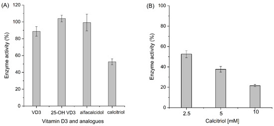Meanwhile, it is worth noting that we also investigated the potential substrate and product prohibition of the AaeUPO. As shown in Figure 5A, incubation with vitamin D3, 25-hydroxyvitamin D3, and alfacalcidol showed no effect on the enzyme activity; only an inhibition effect of calcitriol on the enzyme was observed. This inhibition effect was further confirmed by increasing the calcitriol concentration incubated with AaeUPO (Figure 5B).