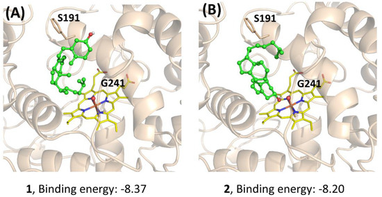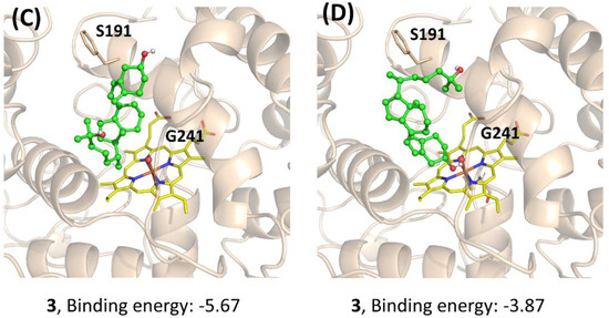 Docking study for the mechanistic insight on the performance of AaeUPO (Pada−I) for calcitriol synthesis. The poses of 1 (A), 2 (B), and 3 (C,D) with Fe=O center are demonstrated, respectively. Key residues (S191 and G241) interacting with the substrates are highlighted. Graphs were generated by PyMOL [33].