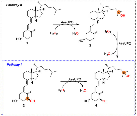 In nature, a broad scope of enzymes is available to catalyze selective oxyfunctionalization of C-H bonds [13,14,15]. The chemo-, regio- and stereo-selectivity make enzymes ideal catalysts in various organic syntheses. Among the reported enzymes, P450 monooxygenases capable of selective hydroxylation of the VD3 at C-1 and C-25 positions have been identified in natural species such as bacteria, yeast, and mammals [16,17,18]. However, the need for a specific electron transport chain involving NAD(P)H cofactors in the catalytic cycle of P450 enzymes leaves limited room for process optimization. Thus far, the potential for industrial application of P450s still remains unexplored [19]. In contrast, unspecific peroxygenases (UPOs) have been considered “ideal” biocatalysts for oxidative functionalization reactions of a variety of activated and nonactivated C-H bonds [20,21,22,23,24,25,26]. A recent report by Hollmann et al. substantially demonstrated the potential of large-scale production of the enzyme yielding practical amounts of these promising catalysts [27]. UPOs share the same active site characteristics (e.g., cysteine sulfur atoms as heme iron ligands) and common reaction chemistry as P450 monooxygenases [28]. UPOs have the unique advantage of only relying on peroxides (H2O2, ROOH) to introduce an oxygen atom to different target molecules; therefore, the reaction scheme is significantly simplified, compared with P450s [29]. Pleasantly, peroxygenases from Agrocybe aegerita (AaeUPO) and Coprinopsis cinerea (CciUPO) have shown to be able to accept vitamin D3 as substrate and yield 25-hydroxyvitamin D3, in which CciUPO excels in selectivity and catalytic activity [30,31]. However, the potential of using peroxygenases for the synthesis of active D3 compounds remains significantly underdeveloped.