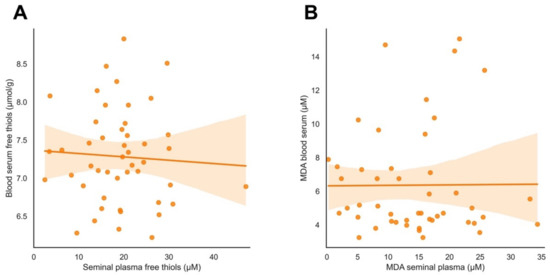 Association between systemic and local-free thiol and MDA levels. (A) No significant correlation between serum-free thiols and seminal plasma-free thiols (r = −0.060, p = 0.690); (B) No significant correlation between MDA levels in serum and seminal plasma (r = 0.007, p = 0.962). Lines represent best-fitting lines from linear regression. Color-shaded areas indicate 95% confidence intervals.