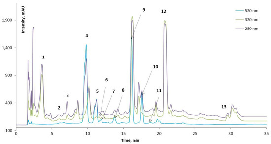 HPLC chromatograms of phenolic and polyphenolic compounds quantified in the extracts of red OS: peak 1-catechin, peak 2-chlorogenic acid, peak 3-vanillic acid, peak 4-cyanidin 3-laminaribioside, peak 5-cyanidin 3-(3″-malonylglucoside), peak 6-ferulic acid, peak 7-peonidin 3-glucoside, peak 8-cyanidin 3-(6″-malonylglucoside), peak 9-cyanidin 3-(6″-malonyl-laminaribioside), peak 10-peonidin 3-malonylglucoside, peak 11-cyanidin 3-dimalonylaminaribioside, peak 12-quercetin, and peak 13-kaempferol.