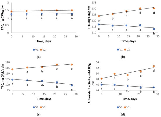 The TAC (a), TFC (b), TPC (c), and antioxidant activity (d) stability of the V1 and V2 powders after 28 days of storage at 5 °C. For each tested phytochemical and storage time of the powder variant, values sharing different letters indicate a significant difference, p < 0.05.