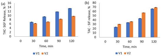 Anthocyanins in the experimental powders were stable during the incubation in the SGF for 2 h (Figure 5a). The powders slightly increased the anthocyanin content during gastric digestion, with approximatively 13.5% for V1 and 10% for V2 after 120 min. The results suggested that the microcapsules coated by the ternary matrices were resistant to the gastric environment of the stomach, and they protect the anthocyanins during passage through the human stomach. In SIF (Figure 5b), the data exhibited that the anthocyanins’ release after 120 min of digestion reached a maximum of 66% for V1 and 70% for V2. Results showed a controlled release of anthocyanins under intestinal conditions, meaning that a significant amount remained in the microcapsules.