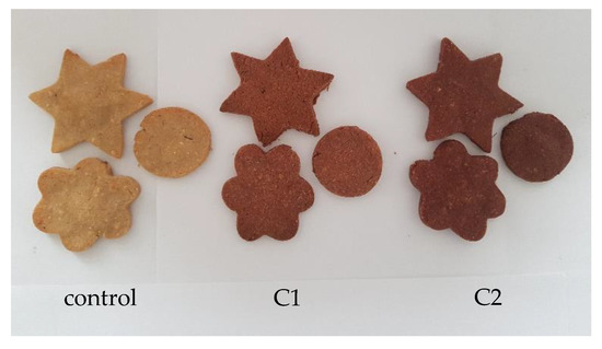 The sensory evaluation of the formulated biscuits was realized using a nine-point hedonic scale. The sensorial analysis was performed following the sensorial characteristics such as appearance, section appearance, firmness, chewability, color, consistency, taste, smell, aroma, aftertaste, and general acceptability. With the increase in powder concentration, the crackers appeared more reddish-brown in color due to the presence of anthocyanins (Figure 6).