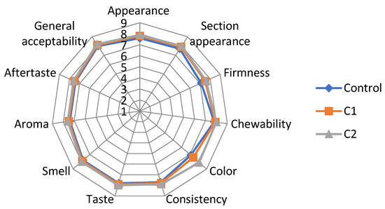 Ten untrained tasters performed a sensory evaluation of the crackers. The participants were consumers of biscuits (appetizers) and pastries. They were given information about the study’s overall goal as well as the required protocols for managing personal data. The panelists were asked to evaluate the appearance, section appearance, firmness, chewability, color, consistency, taste, smell, aroma, aftertaste, and general acceptability of the value-added crackers utilizing a 9-point hedonic scale (1 = extremely dislike; 9 = extremely like). The samples were given three random digit codes and served at room temperature (23–25 °C), under white light, and with 45–48% relative air humidity. The order in which the samples were presented was randomized. After each sample evaluation, panelists were advised to rinse their mouths with water.