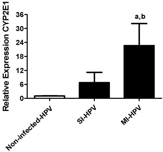 Relative gene expression to CYP2E1 in study groups. Relative expression of CYP2E1 in the non-infected group and groups with single infection (SI-HPV) or multiple infections (MI-HPV). Data are expressed as the means ± SD and were analyzed by one-way ANOVA. Significant difference was defined as p < 0.05. a Infected HPV group vs. non-infected group; b SI-HPV group vs. MI-HPV group.