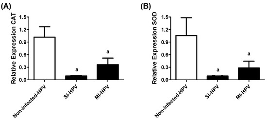 The enzymatic antioxidant systems of CAT and SOD mRNA were evaluated by qRT-PCR. The results showed a downregulation of both enzymes in infected groups compared to the non-infected group (p < 0.05). We detected an 11-fold downregulation of CAT and SOD in SI-HPV in comparison with the non-infected group. We similarly detected downregulations of 3- and 4-fold of CAT and SOD in MI-HPV compared to the non-infected group, respectively, as shown in Figure 3. No differences were detected in the expression of both enzymes between SI-HPV and MI-HPV. Thus, HPV infection alters the expression of antioxidant enzymes in semen.