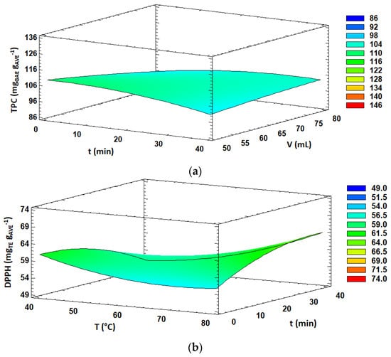 The antioxidant activity, expressed as DPPH radical scavenging activity, varied from 49.9 to 73.4 mg TE g AVE−1 in the 29 MAE experiments carried out in this study (Table 2). DPPH radical scavenging activity was significantly affected (p < 0.05) by three linear effects (ethanol concentration, extraction temperature and solvent volume), three quadratic effects (B2, C2 and A2) and one interaction effect (BC). The linear effects of the ethanol concentration and extraction temperature were positive, while the solvent volume showed a negative effect. Furthermore, all quadratic effects were positive except for extraction time. Overall, the DPPH radical scavenging activity increased with increasing ethanol concentration and extraction temperature, while decreasing solvent volume. Moreover, the interaction effect between the extraction temperature and time showed a significant (p < 0.05) positive effect on DPPH antioxidant activity. As shown in Figure 1b, an increase in extraction time at low extraction temperature values led to a decrease in DPPH antioxidant activity of the extract, whereas increasing extraction time at high extraction temperatures led to enhanced DPPH values. Overall, higher antioxidant activity was obtained at 80 °C and 40 min. It is well known that polyphenols could exert antioxidant activity and many other interesting properties [63]. In this case, similarly to TPC, a high ethanol concentration favored the extraction of certain components which might act as proton-donor substrates, scavenging the radicals which are involved in DPPH reactions and contributing to the antioxidant activity of AVE. On the other hand, high extraction temperatures caused a drop in viscosity and surface tension, enhancing the capacity of the extraction solvent to penetrate the vegetal matrix, resulting in an increase in the solubility of the target compounds [26]. In addition, cell walls might be damaged by the action of high temperatures during the extraction process, which could favor the release of active compounds in the extraction solvent [26,28]. However, it has been reported that some phenolic compounds might suffer thermal degradation when exposed to high temperatures [64], and optimal temperatures for MAE usually do not exceed 100 °C.