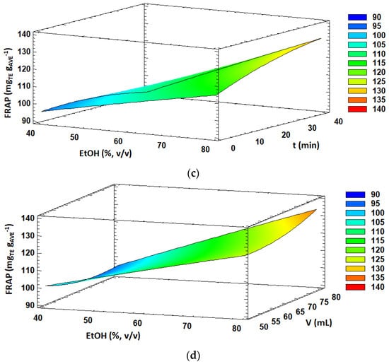 Figure 1. Response surface plots of significant interactions between independent variables on: (a) TPC (volume vs. time); (b) DPPH (temperature vs. time); (c) FRAP (ethanol concentration vs. time) and (d) FRAP (ethanol concentration vs. solvent volume). In all cases, the other factors were fixed at their central values.