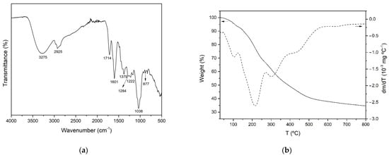 It has been reported that Aloe vera plants contain a wide variety of bioactive compounds, including phenolic acids and derivatives, flavonoids, chromones, anthraquinones, polysaccharides and fatty acids. The FTIR–ATR spectrum of AVE obtained under optimal extraction conditions is shown in Figure 2a. The broad peak observed around 3275 cm−1 was attributed to the stretching vibration of different –OH groups of phenolic compounds such as flavonoids, anthraquinones and chromones [68,69]. The bands at 2925 and 1379 cm−1 might be assigned to C-H stretching and bending vibration of aliphatic hydrocarbons, respectively [68,70,71]. The absorption band at 1714 cm−1 was associated with C=O stretching, indicating the presence of carbonyl functional groups [70,72]. Peaks observed at 1222 and 877 cm−1 might be related to the stretching of C-O-C bonds of acetyl groups of esters and phenols [68,72] and out of plane deformation of C-H bonds in aromatic rings [72], respectively. In addition, according to other authors who characterized polyphenol-enriched extracts from other plant materials, such as Ilex paraguarensis [71], Rosmarinus officinalis [73], Garcinia mangostana [74] and grape seeds [75], the observed peaks at 1601, 1284 and 1036 cm−1 could be attributed to C=C ring stretching vibration [71,73,75], ester C-O stretching [75] or the presence of methoxy groups [74], and C-N stretching vibration of aliphatic amines [71], respectively. As a result of the aforementioned peak assignations, it was concluded that AVE contained a variety of phenolic compounds.