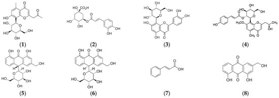 79. Kanama, S.K.; Viljoen, A.M.; Kamatou, G.P.P.P.; Chen, W.; Sandasi, M.; Adhami, H.R.; Van Wyk, B.E. Simultaneous Quantification of Anthrones and Chromones in Aloe Ferox (“Cape Aloes”) Using UHPLC-MS. Phytochem. Lett. 2015, 13, 85–90. [Google Scholar] [CrossRef]