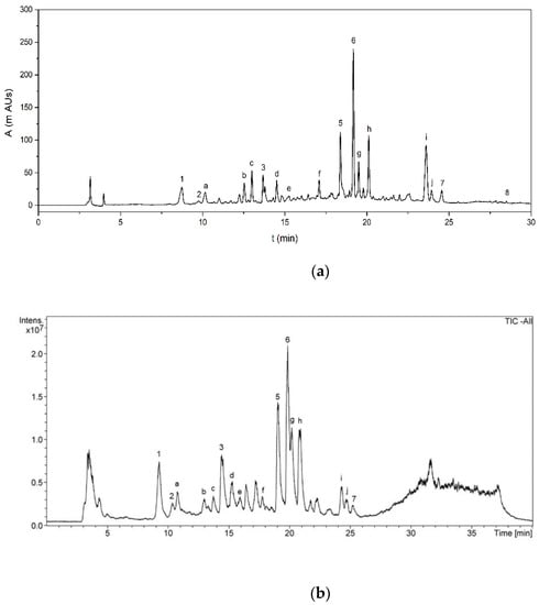 Most plant extracts comprise complex mixtures of different phytochemical constituents with diverse chemical structures, and their analysis remains challenging. Currently, several literature reviews on the identification and quantification of active compounds extracted from plants are available [29,30,31]. Even though some analytical techniques, such as gas chromatography and capillary electrophoresis, have been employed, high performance liquid chromatography (HPLC) combined with mass spectrometry (MS) has been by far the most frequently used technique for the identification and quantification of secondary metabolites extracted from plants [32,33,34,35]. Successful phenolic profiling strongly relies on proper optimization of chromatographic conditions, which are crucial for the selection of adequate mobile phases and gradient elution programs.