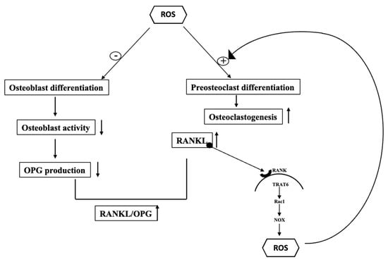 ROS can also limit, or even block and stop, the activity and differentiation of osteoblasts destined for apoptosis, as well as osteocytes, thus favoring even more osteoclastogenesis [82,83,84].
