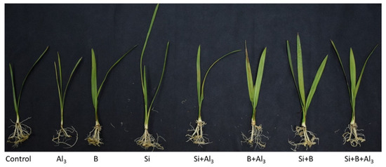 The presence of silicon (Si) in the soil is considered a beneficial mineral element for plant growth and development and for mitigating biotic and abiotic stress conditions. Therefore, the stress-alleviating effects of Si vary with plant species, and generally a significant stress-mitigating role is reported in plants with a higher accumulation of Si in different tissues [20]. Similarly, Si enhances Al3+ tolerance in plants by the activation of antioxidant activities [21,22], the formation of the Si-Al3+ complex [23], pH increase [24], the enhancement of organic acid anions, mineral uptake, and the exudation of phenolic compounds [25], as well as hormonal signaling [21,26,27,28]. While Si’s involvement in ameliorating Al-induced stress could be due to altering Al transporter activities, conclusive evidence regarding the effect of Si on regulating Al transporters is not available. Moreover, the formation of complexes of boron and silicon in soil under certain environmental conditions due to sharing considerable chemical similarity has been reported to alter heavy metal phytotoxic effects, uptake, and transportation [25]. However, there is also a shortage of reports regarding the stress-alleviating role of Si under Al3+ toxicity in the presence of boron in date palm.
