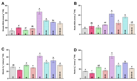 The ROS-induced peroxidation of lipid membranes and superoxide anion (O2•−) produce stress-induced damage at the cellular level. We found that Al3+ stress significantly increased the production of MDA and O2•−, which damage the cell structure due to its highly reactive and toxic nature. A significant augmentation in MDA level was noticed only in the roots of Al3+-treated plants compared to the plants treated with Si, B, and their combination (Figure 2). The interaction of Si and B significantly mitigated the toxic effects of Al3+ toxicity. It exhibited the lowest level of MDA in roots by approximately 50%, followed by sole Si- and B-treated plants with 45% and 16% reduced levels, respectively, compared to only Al3+-treated plants. Likewise, the MDA level in the shoots was either not significantly or less altered by Si, B, and Si + B in the absence of Al3+ stress. However, exposure to Al3+ significantly upregulated MDA levels in only Al3+-treated plants by 37%, 43%, and 50% compared with Si, B, and their combination, respectively.