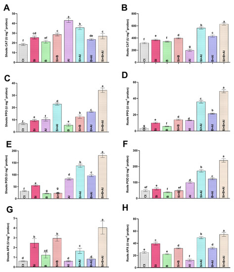 The effect of sole silicon (Si), boron (B), and their combination on antioxidant regulation (catalase, CAT; polyphenol oxidase; PPO peroxidase, POD; and ascorbate peroxidase, APX;) of date palm roots and shoots under Al-induced stress. (A,B) CAT, (C,D) PPO, (E,F) POD, (G,H) APX. Bars with different letters are describing statistically significant differences (p < 0.05) between means by using one-way analysis of variance (ANOVA), followed by Duncan’s multiple range test (DMRT). Values describe the mean (of four replicates) ± the standard error.
