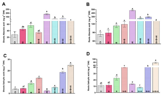 Endogenous hormonal (abscisic acid and salicylic acid) regulation by the sole and interactive effects of Si and B administration under Al-induced stress in date palm shoots and roots. (A,B) Abscisic acid, (C,D) Salicylic acid. The bars illustrate means (of four replications) ± standard error. The means with different letters are significantly different (p < 0.05) as evaluated by the Duncan Multiple Range Test (DMRT).