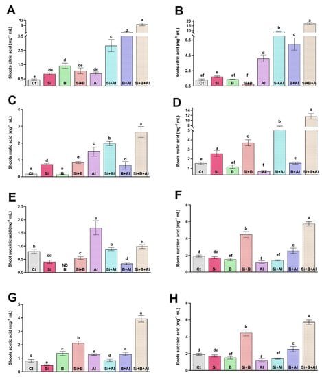 On the contrary, the acetic acid level was significantly enhanced by the combined treatment of Si + B in both roots and shoots under control and stress conditions, compared to other treatments. The exposure of Al3+ toxicity significantly reduced the acetic acid level in the roots of sole Al3+-treated plants compared to their respective control plants by 1.7-fold, whereas Si + B-treated plants demonstrated approximately 5.1- and 3.2-fold greater levels of succinic acid in comparison with the roots and shoots of sole Al3+ treated plants, respectively.