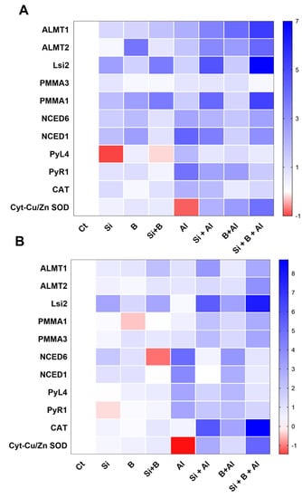 The sole and in combination effect of Si and B on the regulation of gene expressions in date palm (A) shoots and (B) roots under control and Al-induced stress conditions. The red color represents a lower relative transcript accumulation concerning control, and the blue color represents a higher transcript accumulation.