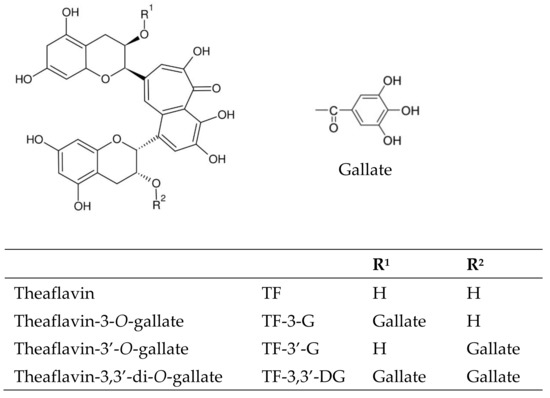 Chemical structures of theaflavins (TF, TF-3-G, TF-3′-G, and TF-3,3′-DG) found in black tea.