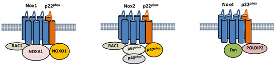 Composition of Nox1, Nox2, and Nox4. Nox1, 2, and 4 are six-transmembrane proteins. Nox1 forms a complex with p22phox, Noxo1, Noxa1, and Rac, and its activity is regulated by the interaction. The activity of Nox2 is also regulated by interaction with cytosolic factors, such as p40phox, p47phox, p67phox, and Rac1. The activity of Nox4 is positively and negatively regulated by POLDIP2 and Fyn, respectively.