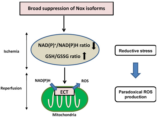 Nicotinamide adenine dinucleotide (NAD+)/reduced NAD+ (NADH), phosphorylated NAD+ (NADP+)/reduced NADP+ (NADPH), and reduced glutathione (GSH)/GSH disulfide (GSSG) are critical redox couples that maintain the reducing environment in cells by serving as cofactors or substrates for neutralization of ROS. These redox couples are also intimately linked with cellular energetics. NADH is a pivotal electron donor during mitochondrial oxidative phosphorylation (OXPHOS), whereas NAD+ is an electron acceptor during glycolysis. NADPH is used as a major electron source for reductive biosynthesis of fatty acids and nucleic acids [44,45]. Disturbance of redox conditions provokes redox stress, including both oxidative stress and reductive stress. Compared to the wealth of knowledge regarding oxidative stress, reductive stress has been investigated less intensively. Reductive stress was first proposed in the context of hypoxia and reperfusion in hepatocytes, where reductive stress is stimulated when electron carriers are reduced under hypoxic conditions and re-oxidized after the oxygen supply is restored, leading to a burst of ROS generation [46]. Reductive stress has been generalized as a condition in which the balance between the cellular reducing capacity and pro-oxidant levels shifts to favor the reducing capacity, leading to excess accumulation of reducing equivalents (NADH, NADPH, and GSH) exceeding the capacity of endogenous oxidoreductases [47,48]. Broad suppression of Nox isoforms induces reductive stress during I/R injury. Overexpression of DN-Nox induces a markedly reduced state characterized by decreased NAD(P)+/NAD(P)H and increased GSH/GSSG ratios. Increased reductants paradoxically promote mitochondrial ROS production through the direct transfer of electrons to oxygen in the mitochondrial ETC during ischemia, resulting in no recovery of heart function after reperfusion (Figure 3). Since Nox activities are intimately associated with other oxidases in the ETC, optimal regulation of Nox-derived ROS levels is important to prevent both oxidative and reductive stress during myocardial I/R injury.