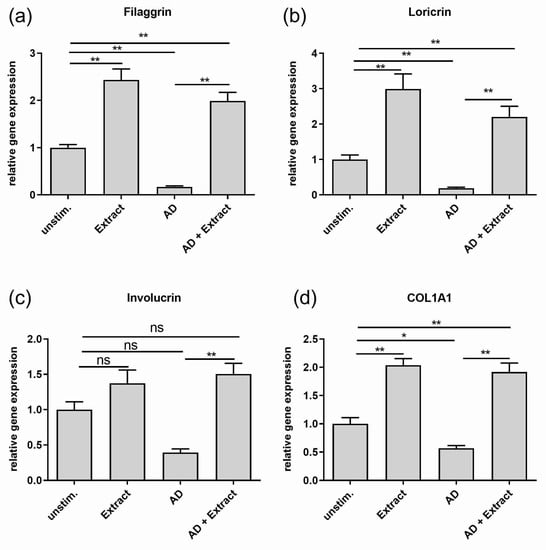 (I) For simulating healthy skin conditions, untreated differentiated normal human keratinocytes (NHEKs) were used to evaluate the effects of the extract in vitro. Stimulation with the extract led to significant two to three-fold higher gene expressions of the epidermal differentiation markers filaggrin and loricrin and the extracellular matrix molecule collagen type I alpha 1 chain (COL1A1) as compared to unstimulated keratinocytes (Figure 1 a,b,d). No significant upregulation of gene expression was observed for involucrin (Figure 1c). Analysis of the inflammation marker revealed a significant downregulation of IL-24 gene expression (Figure 2a) by the extract. No effects of the extract on the already low gene expression of CCL26 and carbonic anhydrase 2 were seen (Figure 2b,c).