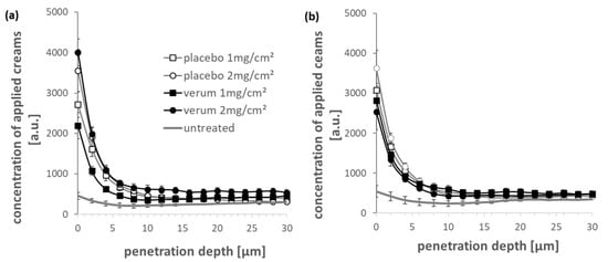 The penetration profiles of the two creams into the skin are shown in Figure 3. For both creams, the concentration of penetrated compounds decreases exponentially from the surface into the skin. There is not enough evidence to show that there is a difference between the verum and the placebo cream in the penetration depth of cream compounds. The typical stratum corneum thickness is approx. 18 µm [29], so compounds from both verum cream and the placebo cream can permeate the entire stratum corneum. The penetration depth of these compounds (both creams) is not significantly related to the penetration time and dosage.