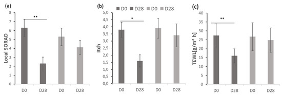 Comparison of (a) local SCORAD, (b) itch and (c) TEWL after four weeks (D28) compared to baseline (D0). Mean ± SEM (n = 10); level of significance * p < 0.05, ** p < 0.01.