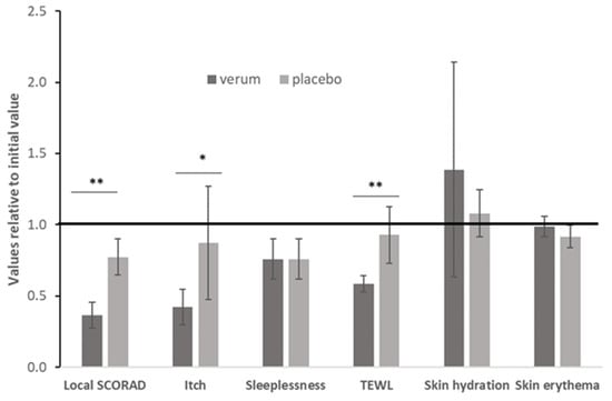 The relative changes to the initial values are shown in Figure 5. In addition to the before presented parameters, sleeplessness, skin hydration and skin erythema were assessed.