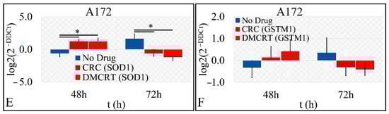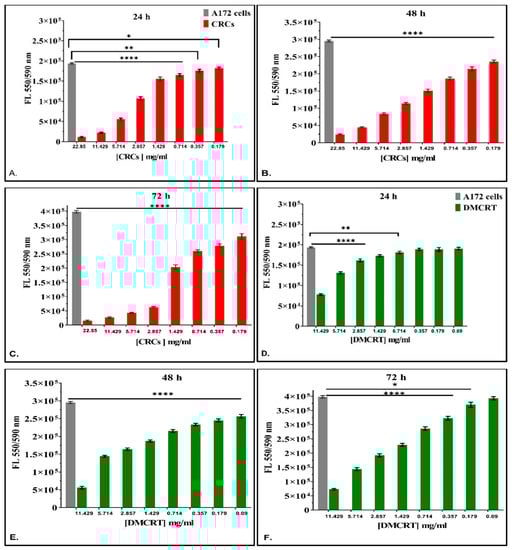 A172 cells were incubated with CRCs and DMCRT in various concentrations as described in the Section 2. In particular, when analyzing drug effects with respect to concentration for each time interval studied (24, 48 and 72 h) CRCs and DMCRT were indifferent at 0 h of exposure (data not shown), for any concentration, as expected. CRCs (Figure 1A–C) exhibited at all-time points and for concentrations ≥ 0.179 mg/mL a significant dose-dependent cytotoxic effect; the cytotoxicity increased, as the compound’s concentration augmented. DMCRT did not manifest any effect at concentrations ≤ 0.71 mg/mL and 0.09 mg/mL, at 24 and 72 h, respectively, whereas for the rest of concentrations, especially at 48 h there was a clear dose-dependent effect, when compared with the untreated cells (Figure 1D–F).