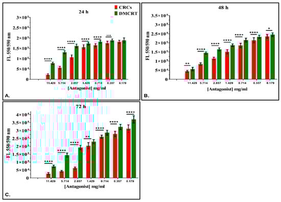 In addition to the previous analyses, the time-dependent efficacy of CRCs and DMCRT at each concentration tested was investigated. Measurements were initially performed at 6 h, meaning at the time just after the addition of the drug and the staining agent and every 24 h thereafter i.e., at 24, 48 and 72 h. At 6 h, as expected, no significant differences were present for any tested bioactive compound (data not shown).