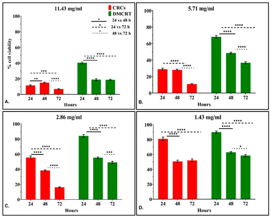 DMCRT manifested a significant time-dependent cytotoxic effect for all concentrations, when comparing 48 vs. 24 h (p < 0.0001 for 24 vs. 48 h) and for concentrations ≥ 0.36 mg/mL, when considering 72 vs. 24 h (p < 0.0001 for 24 vs. 72 h). When comparing 48 vs. 72 h, DMCRT was more potent at 72 h for concentrations 1.43–5.71 mg/mL, whereas when considering the highest concentration of 11.43 mg/mL the effect was already maximized at 48 h of exposure (Figure 3A–G).