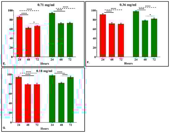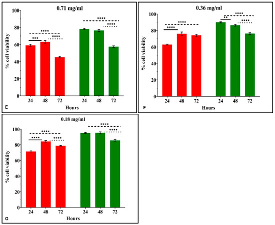 DMCRT exhibited significant time-dependent cytotoxicity for all concentrations at 72 h, as compared to both 24 and 48 h (p < 0.01 for 72 vs. 24 or 48 h), manifesting a more stable cytotoxic effect with a gradual decline in cell viability. The same time-dependent effect was observed when comparing 24 and 48 h, for concentrations 1.43–2.86 mg/mL (p < 0.05 for 48 vs. 24 h), whereas for high concentrations ≥ 5.71 mg/mL the effect was already significant at 24 h (Figure 9A–G).