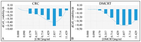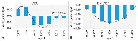 Similar to A172 cells, the first derivative of cell viability with respect to individual concentrations was calculated. Cells exposed to CRCs manifested a higher cytotoxicity rate for concentrations between 0.714 mg/mL and 2.857 mg/mL (Figure 10A), whereas DMCRT manifested a quasi-normal distribution, with higher cell cytotoxicity rates at 1.429 mg/mL (Figure 10B). TE671 cells exposed to CRCs manifested three concentrations with similar effectiveness (0.71, 1.43 and 2.86 mg/mL), indicating three concentrations which are more time-dependent (Figure 9A). In addition, the cells manifested two concentrations (0.18, 0.36 mg/mL), with positive derivative, indicating that cells recovered during treatment (Figure 9A). At the same time, cells exposed to the higher concentrations (5.71, 11.43 mg/mL) manifested a derivative close to zero, indicating a dose-dependent effect, as cell viability at 72 h was close to cell viability observed at 24 h (Figure 9A).