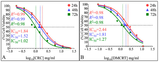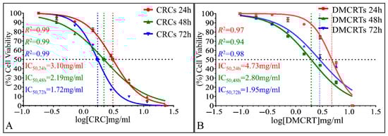 The time dependent effect of CRCs and DMCRT, as well the in vitro sensitivity of TE671 cells on CRCs were verified via IC50 calculations. IC50 were calculated 1.84 mg/mL (R2 = 0.99), 1.52 mg/mL (R2 = 0.99) and 1.02 mg/mL (R2 = 0.98), for CRCs, at 24, 48 and 72 h, respectively (Figure 11A). DMCRT manifested IC50 values of 2.44 mg/mL (R2 = 0.98), 1.81 mg/mL (R2 = 0.98) and 1.27 mg/mL (R2 = 0.98) at 24, 48 and 72 h, respectively (Figure 11B). In addition, IC50 regressions produced similar simulation results for CRCs and DMCRT.