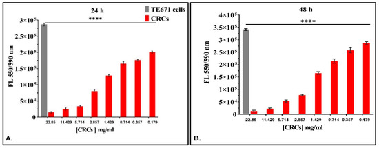 TE671 cells were incubated with various concentrations of CRCs and DMCRT. When analyzing drug effects with respect to concentration for each time interval studied (24, 48 and 72 h), CRCs and DMCRT were indifferent at 0 h of exposure, as expected (data not shown). Overall, both CRCs (Figure 7A–C) and DMCRT (Figure 7D–F) exhibited significant dose-dependent cytotoxicity at all-time points, when compared with untreated TE671 cells; as their concentration increased, cell viability was reduced with the exception of the lowest concentration of DMCRT (0.09 mg/mL) at 48 h.