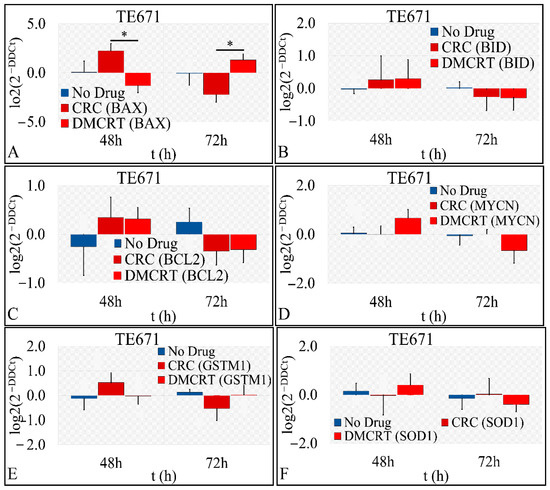 Gene expression under CRCs and DMCRT treatment for BAX (A), BID (B), BCL2 (C), MYCN (D), SOD1 (E) and GSTM1 (F) (* depicts a significance at the p < 0.05 level).