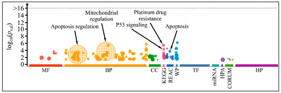 Gene ontology annotation of investigated genes (BAX, BID, BCL2, MYCN, SOD1, GSTM1). Major functions included apoptosis regulation, mitochondrial regulation, p53 signaling, platinum drug resistance and apoptosis (Legend: MF: Molecular function; BP: Biological process; CC: Cellular component; KEGG: KEGG pathway database; REAC: Reactome pathway database; WP: WikiPathways; TF: Transcription factor binding motifs; MIRNA: miRNA targets; HPA: The human protein atlas; CORUM: The comprehensive resource of mammalian protein complexes; HP: Human phenotype ontology).