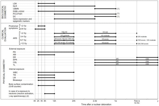 The kind of triage varies with the type of radiological or atomic event. For instance, in the case of an atomic explosion, an enormous number of individuals should be assessed, including those affected by a high dose and those having negligible or no actual injury. The dose will be a critical boundary for a clinical triage. As of now, the most productive and available triage technique is the utilization of consecutive complete blood counts to evaluate lymphocyte exhaustion that is associated with assessed whole-body dose radiation exposure. If fast blood testing would not be conceivable, dose assessment can be at first evaluated dependent on basic boundaries, i.e., correlations between the extent of the body exposed to the radiation and the % of the radiation levels estimated in the environment; victim’s shielding activities after the explosion; and signs and side effects from exposure to radiation or early radioactive particles’ aftermath [24]. The radiation dose classes allude to dosages affecting the whole body or a large portion of the body (partial exposure). Notwithstanding the straightforward boundaries referenced above, the dose can be additionally be assessed dependent on: (a) the period until onset of early signs, (b) the seriousness of the signs (i.e., the acute radiation syndrome, ARS), and (c) the biodosimetry methods [25,26,27]. Even though vomiting is a serious basic symptom after whole or huge partial body radiation exposure, it cannot be utilized to anticipate the radiation dose received. Vomiting can likewise be brought about by head injury, uneasiness, or other pathology [28].