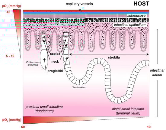 Adult form of the cestodes is exposed to the intestinal oxygen concentration. The image shows a structural drawing of the adult tapeworm form of Echinococcus granulosus (left; size range 2–7 mm) and Taenia solium (right; size range 2–7 m), attacking the intestinal epithelium of their definitive host. Oxygen tension in the intestinal tissue decreases the further away parasites are from the intestinal capillaries, while the oxygen concentration in the intestinal lumen decreases as parasites move towards the colon, where the environment is practically anaerobic. Oxygen concentrations were obtained from references [33,34,35,36]. The size of the parasites was obtained from the Laboratory Identification of Parasites of Public Health Concern website (https://www.cdc.gov/dpdx/ (accessed on 17 February 2022)).