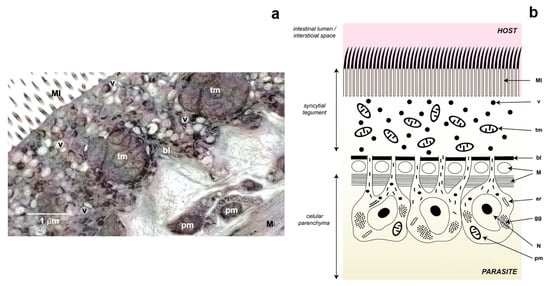The parasitic flatworms of the Neodermata group have a glycocalyx rich in carbohydrates in their external part of the membrane that limits the tegument, which consists of a simple syncytium that covers the entire surface of these worms [44]. However, this tissue results from the fusion of cytoplasmic projections of parenchymal cells (also known as cytones) that are found below the basement membrane and whose function is to provide a constant flow of proteins and other molecules to the tegument [45] (Figure 3). Ultrastructural adaptations can be present such as microtriches in the case of cestodes, which increase the surface area of the parasite allowing a greater exchange between it and the host, as well as recognition mechanisms through the glycocalyx [46].